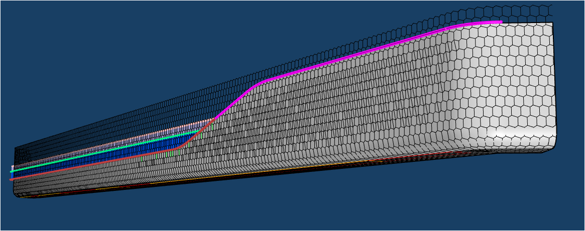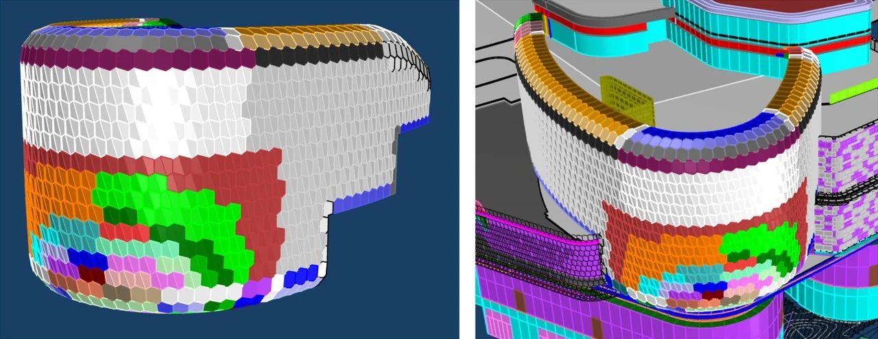 南裙樓船頭造型內部鋼結構均有扭轉,要求拐角幕墻呈現雙曲面效果;屋檐幕墻設計圍繞龍鱗造型,分解為單片“六邊形”元素展開,拐角弧度造型對鋁板制造及安裝工藝要求極高。